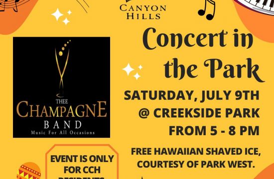 Concert in the Park is scheduled for Saturday, July 9th from 5-8 PM at Creekside Park (located at 3200 Lost Road). This event is free of charge to residents of Cottonwood Canyon Hills and residency…