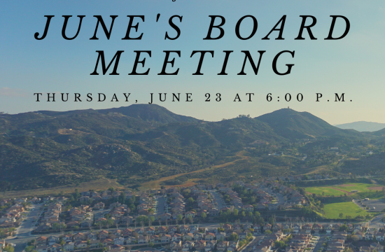 The next meeting of the Board of Directors is taking place on Thursday, June 23rd. The Regular Session will begin at 6:00 PM in the Cottonwood Canyon Hills Clubhouse at 31989 HOLLYHOCK LAKE ELSINORE, CA…