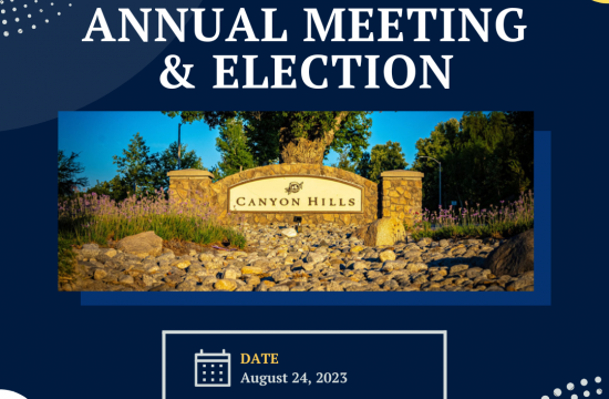 The Annual Meeting and Election is scheduled for Thursday, August 24, 2023, at 4:00 pm. The meeting will be held in the Clubhouse at 31989 Hollyhock St., Lake Elsinore, CA 92532. All owners are welcome…